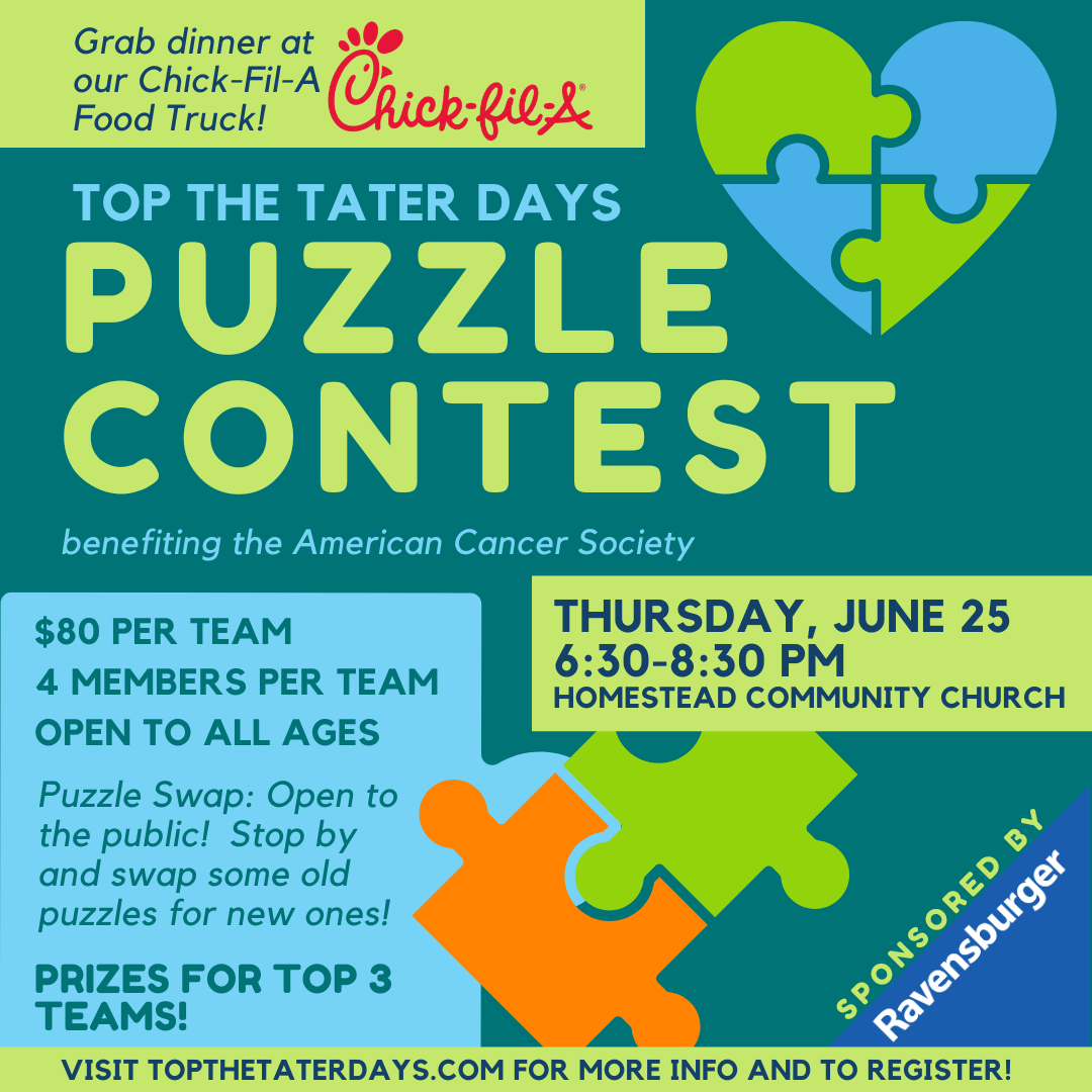 Event Description: The Top The Tater Days Puzzle Contest is making a debut this year. Speed puzzling has become hugely popular and we are bringing the fun to Top The Tater Days. The Puzzle Contest is a fundraiser for the American Cancer Society - Relay For Life of Farmington, MN. Proceeds will go toward cancer research, prevention and patient support. Teams of 4 will compete to complete a 500 piece puzzle within 2 hours. Teams will each have a 6' round table. Top 3 teams will receive a prize.